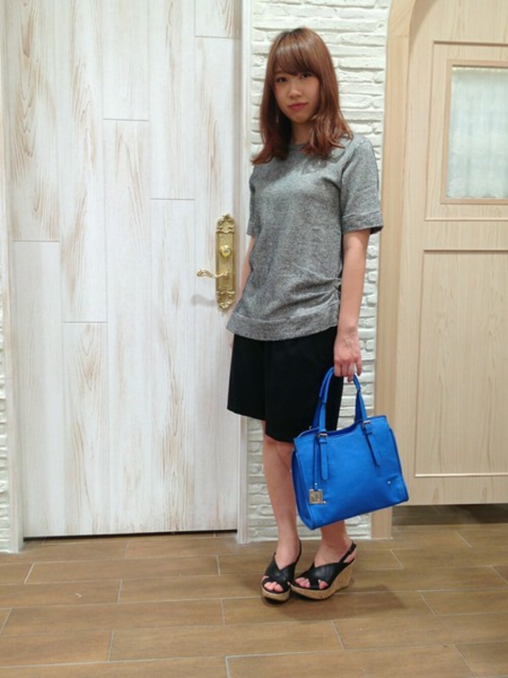 デザイン系のアイテムをさらっと合わせたシンプルなモードカジュアルスタイル。バッグのブルーをさし色に☆