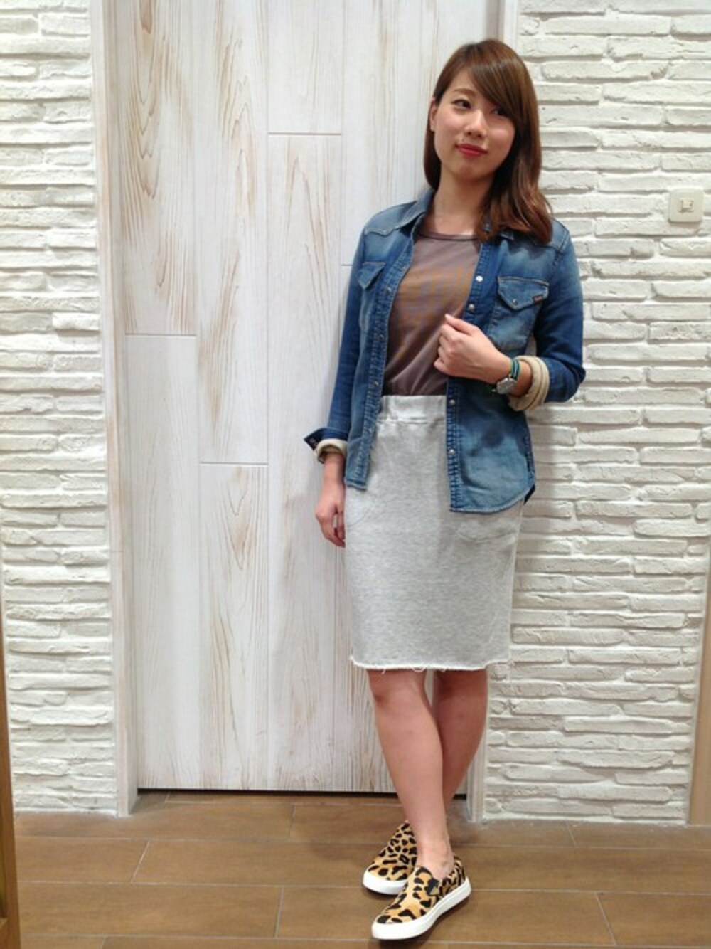 ラフなアメカジスタイル♪休日のお出かけやレジャーにお勧めです。 レオパード柄のスリッポンがアクセントになっています。