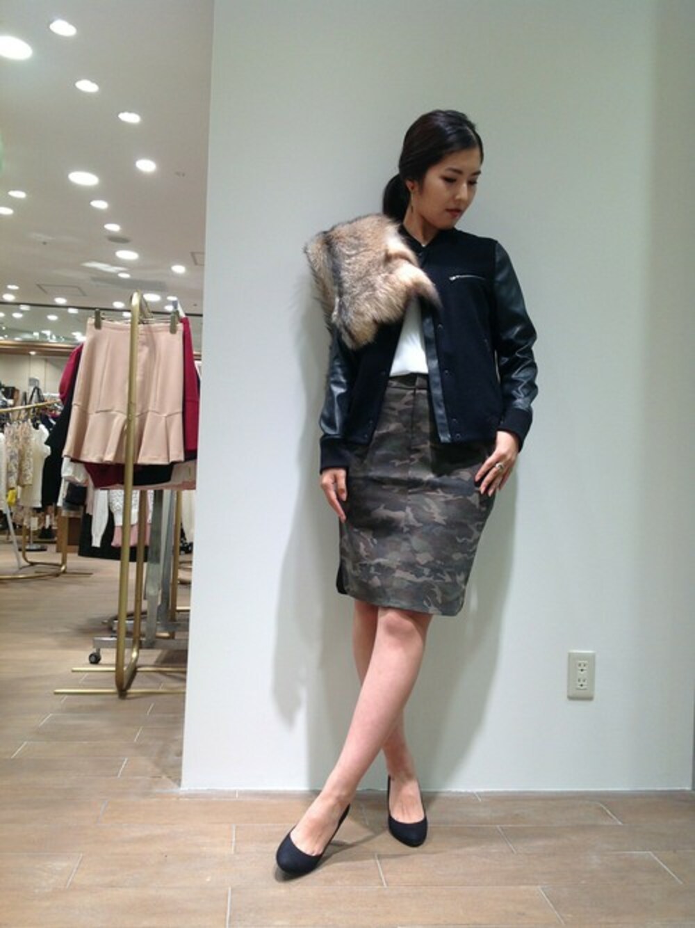 スタジャン×カモフラスカートのカジュアルスタイルに、 ヒールパンプスをファーショールでフェミニンなエッセンスを。ゴージャスの仕上がりました。
