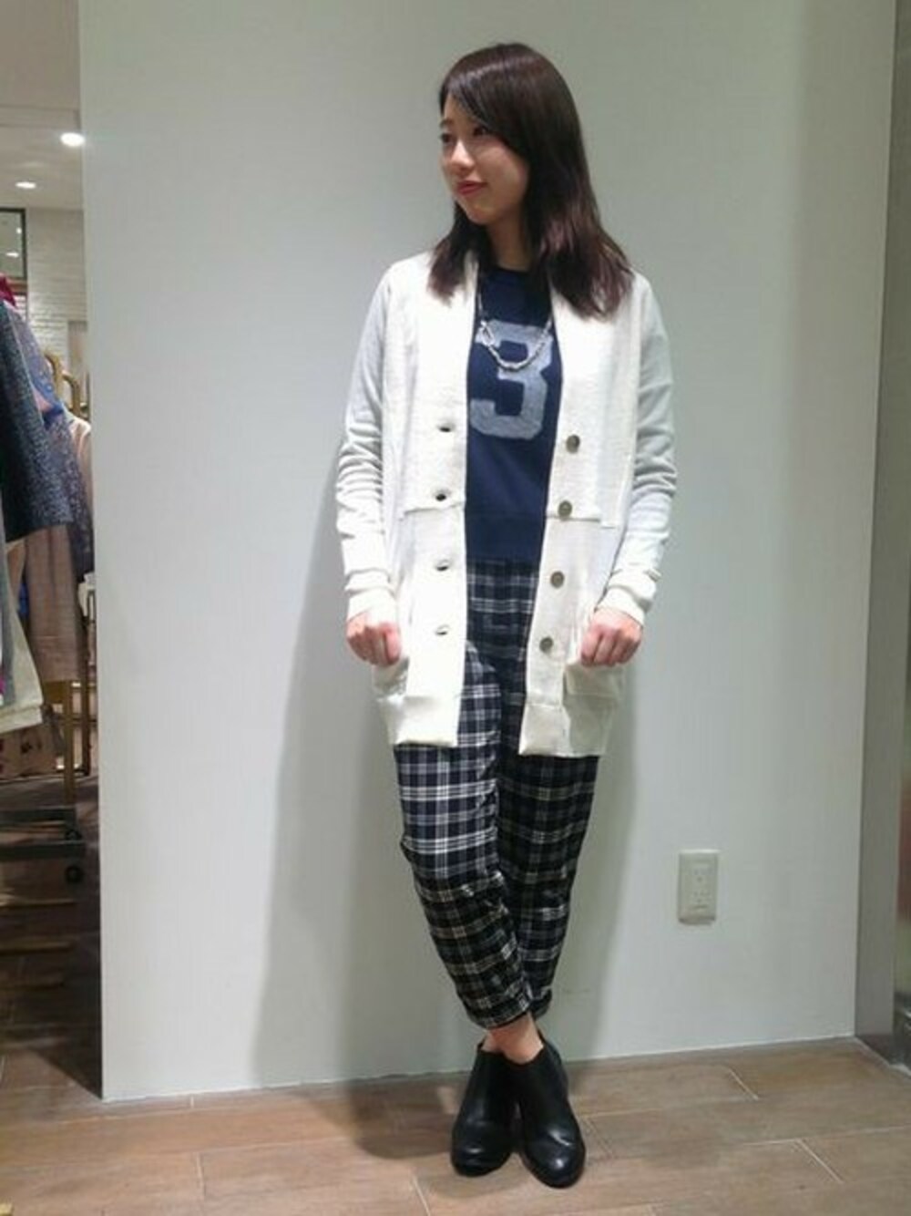 ネイビーを基調にまとめて、差し色としてホワイトのカーディンガンを羽織りました。 今シーズンも注目のホワイトで、トレンド感も演出★
