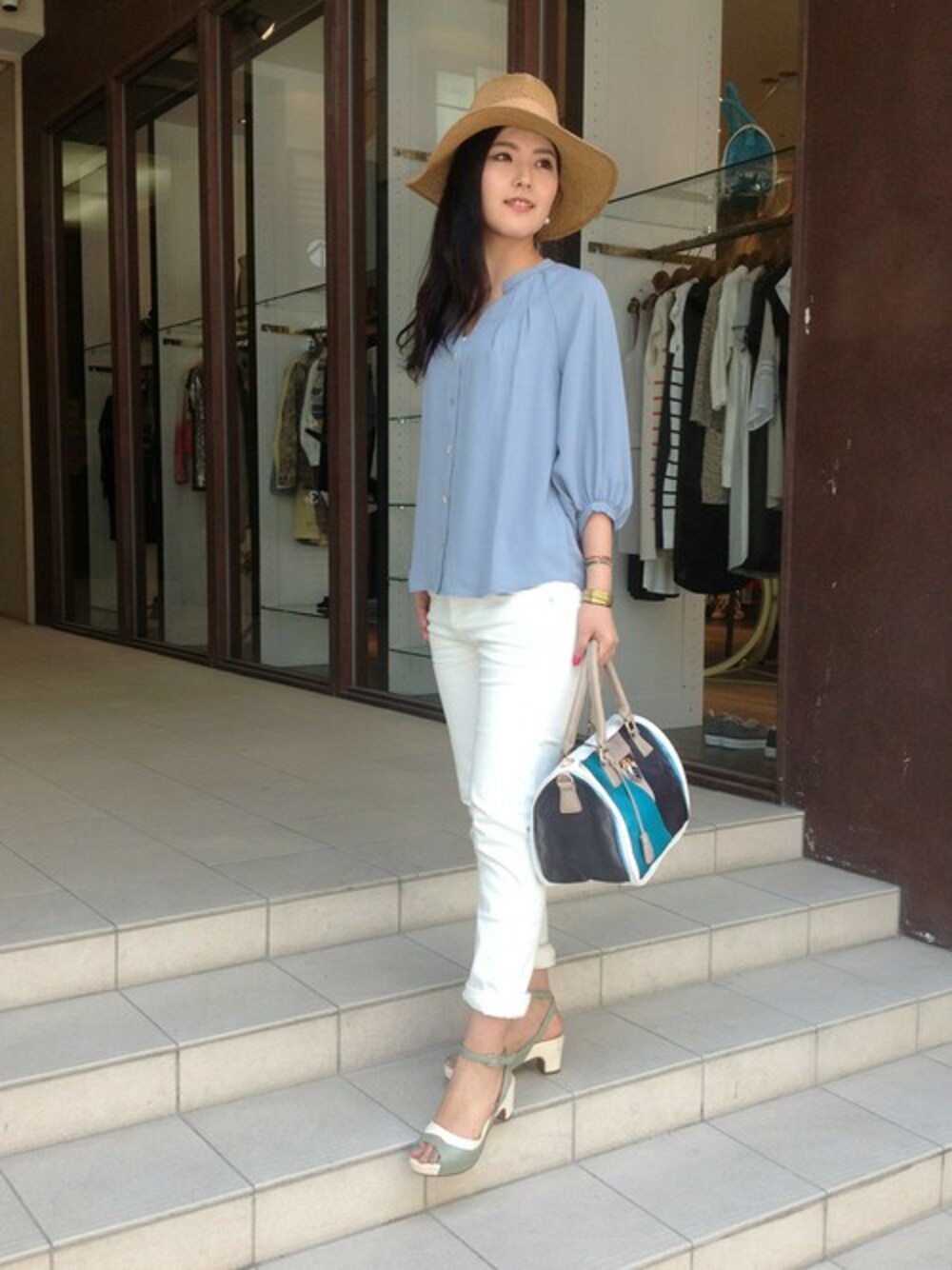 新作のブラウスは、涼しげなカラーとバーボタンがポイントです。たっぷりしていますが、綺麗な落ち感が出て女性らしくきまります。 ホワイトとブルーを基調に爽やかにスタイリングしました。