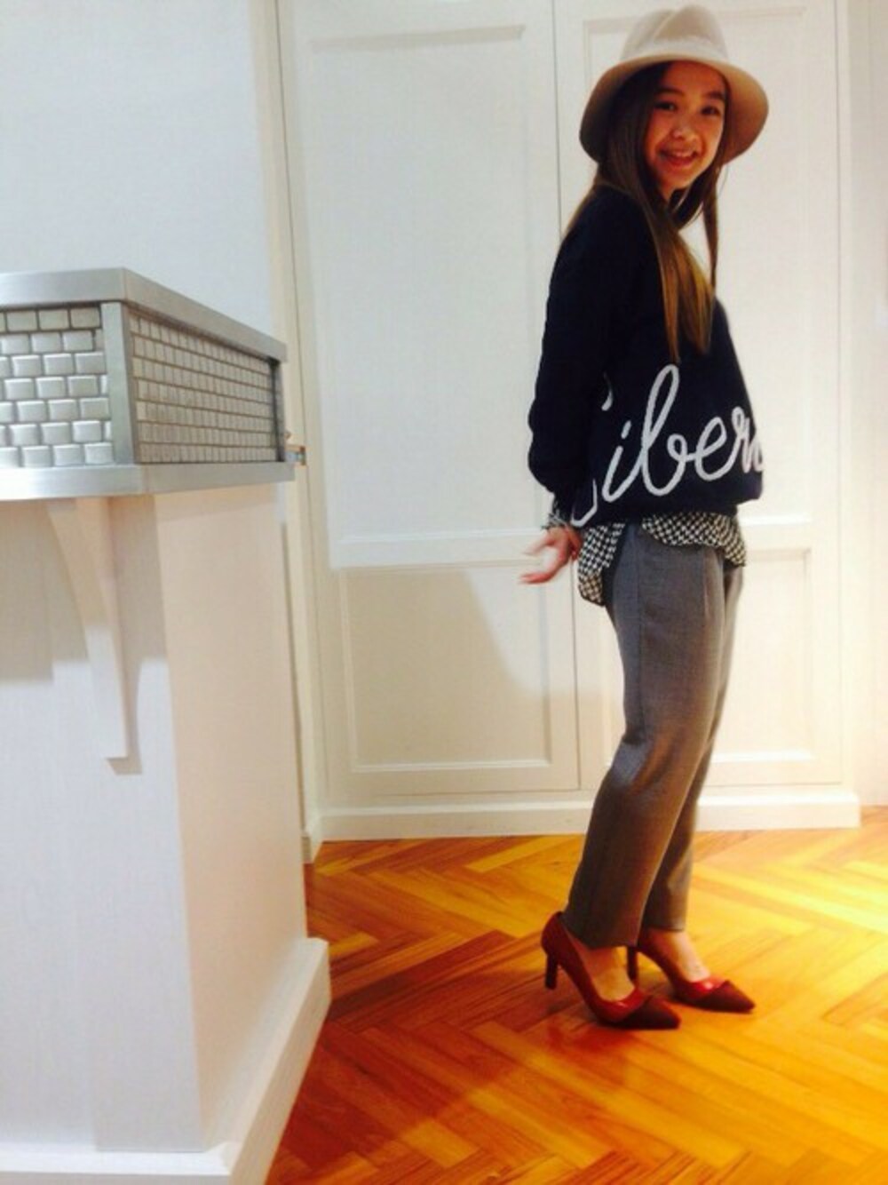 サイドに入った“Siberia"のロゴがポイントのスウェットトップス。ギンガムチェックのシャツをレイヤードして、 カジュアルになり過ぎないように、ハットとパンプスで女性さしさをプラスしました。