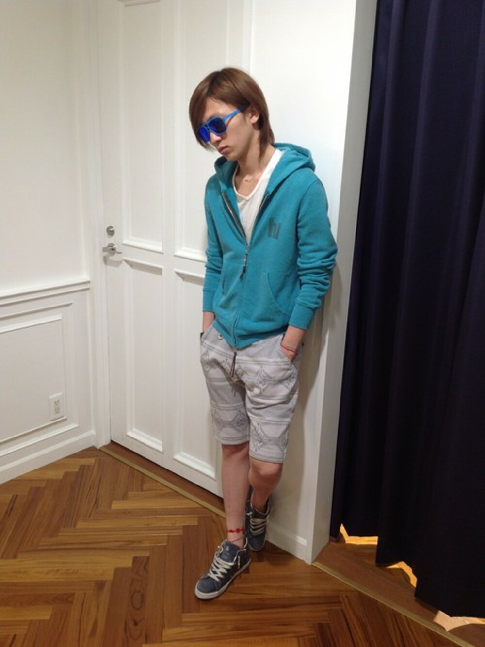 ブルーとホワイトを基調にした、サーフスタイル。ラフになり過ぎないように、足元はハイカットのスニーカーで♪