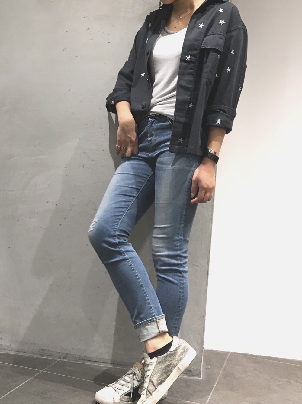 DROIT BELLOの羽織は刺繍の星とビジューの星が可愛いく、丈感が絶妙です。 同じ星のポイントがある、ゴールデングースの靴で統一感を。