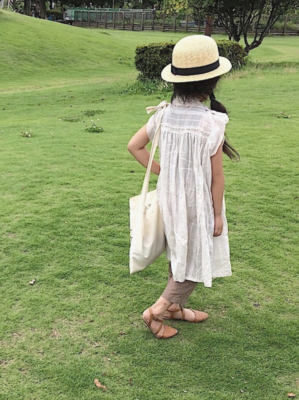 娘coordinate* いつかのコーデ。 リネン素材の大人用ブラウスをリメイクして、前ボタンのワンピースにしました。