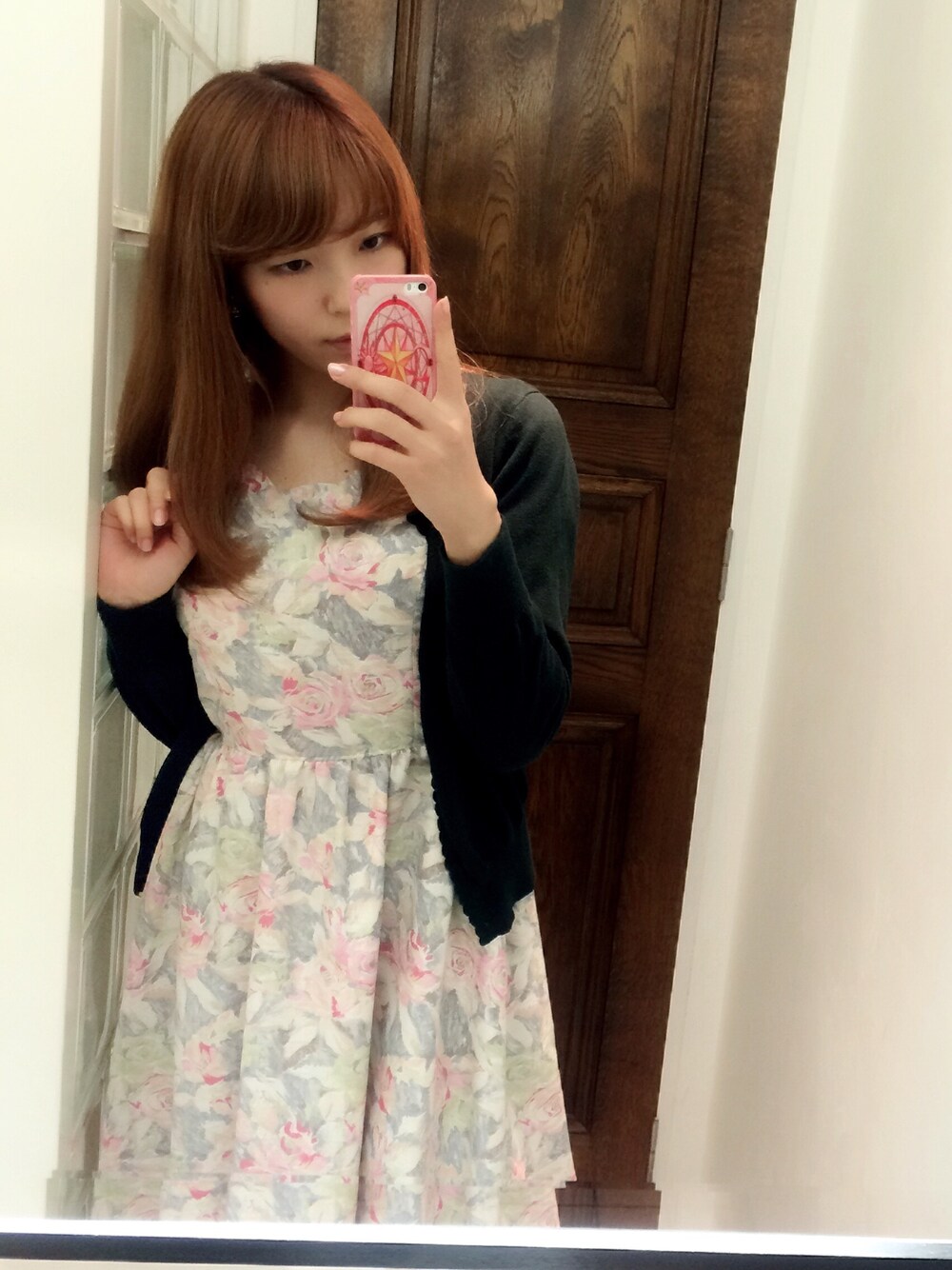 ピンク系のワンピース、グリーン系のカーディガン/ボレロを着用したレディースの秋コーディネートの1枚目の写真