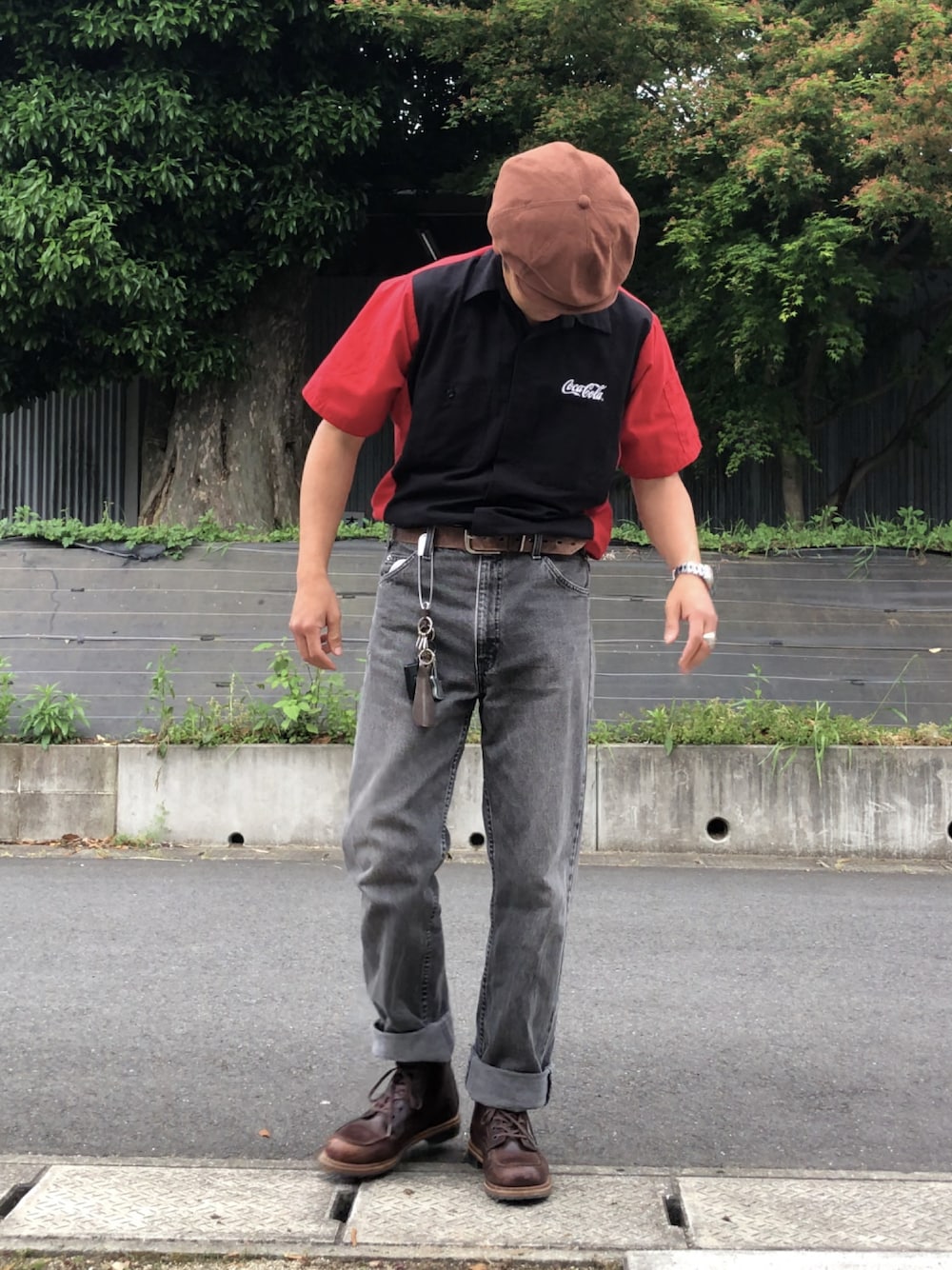 ブラウン系のブーツ、ブラック系のデニムパンツを着用したメンズの春コーディネートの1枚目の写真
