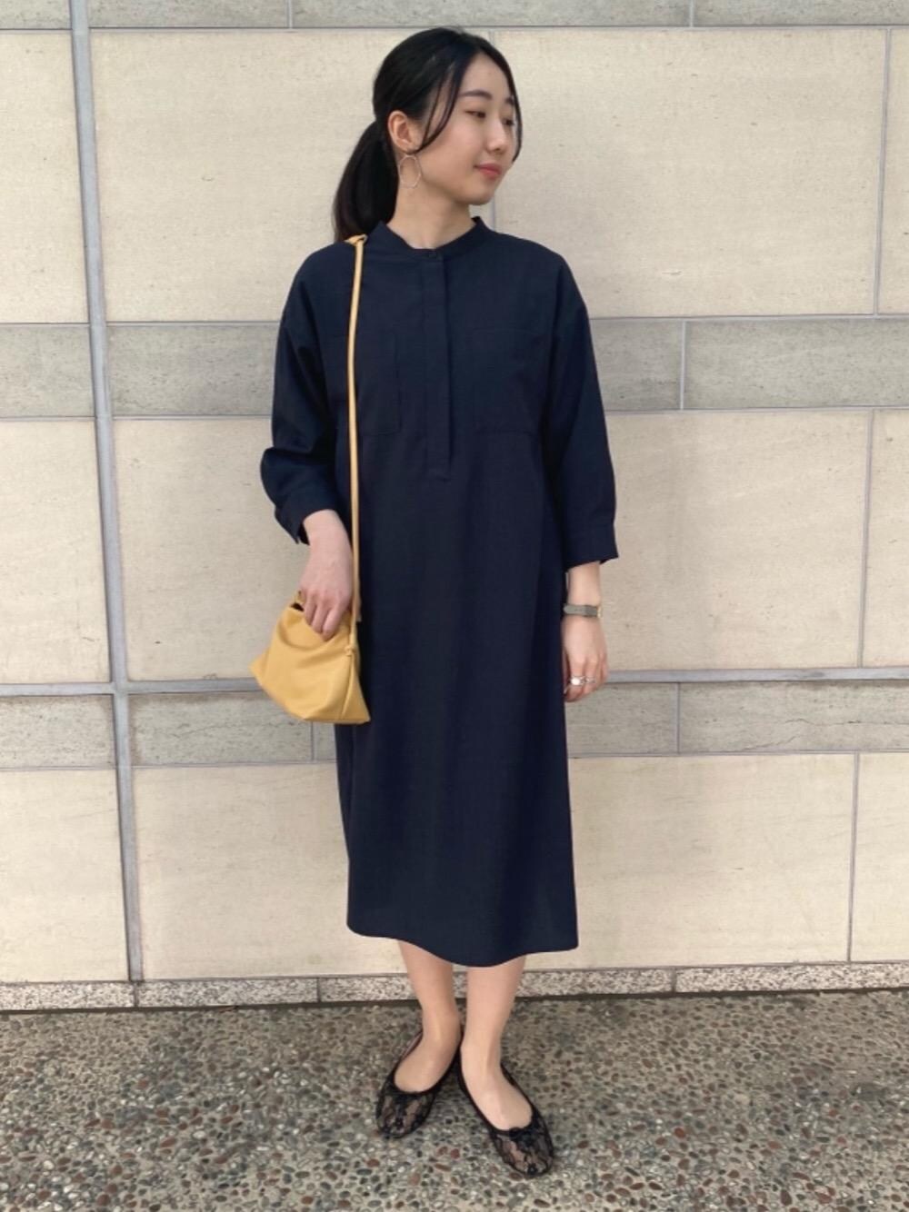 無地のネイビーのワンピースは一枚でも着やすく、色で重くならないように黄色のバッグをワンポイントに合わせました。 シンプルかつ上品な、印象になるようにレースのシューズを選びました。