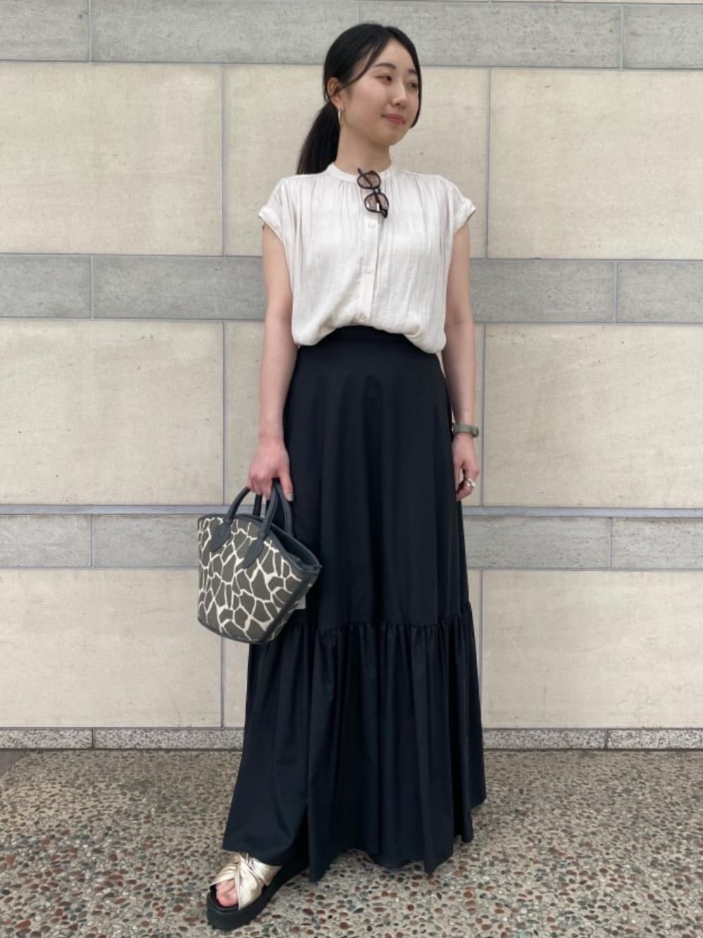 【158㎝】全体的にモノトーンカラーでまとめました。足元はゴールド で夏らしいアクセントに。