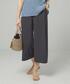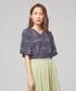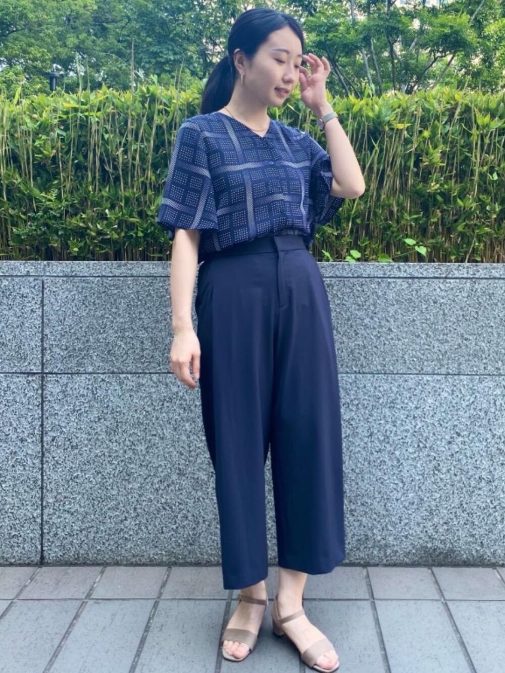 ネイビーのワントーンでまとめました。ブラウスはフロントボタンでON/OFFどちらでも着用していただけるアイテムです。インナーをホワイトにすることで爽やかな印象に。