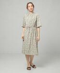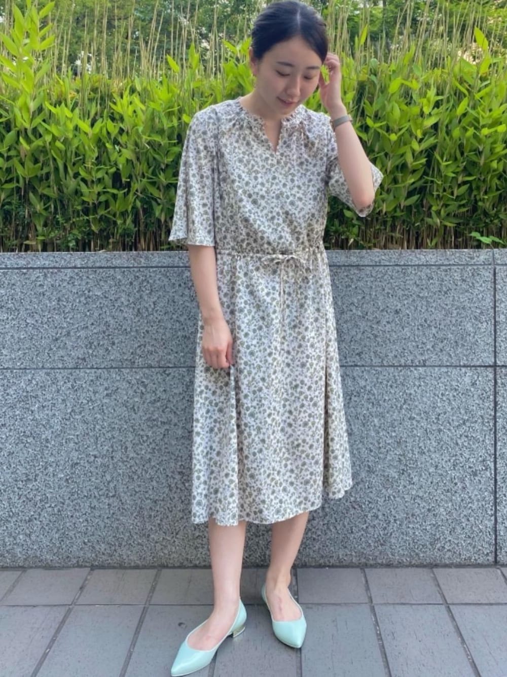 爽やかな色使いにボタニカル柄のワンピースで涼しげなオフィスコーディネートにまとめました。 足元はライムのレインシューズで合わせ、梅雨時期にもオススメのコーディネートです。