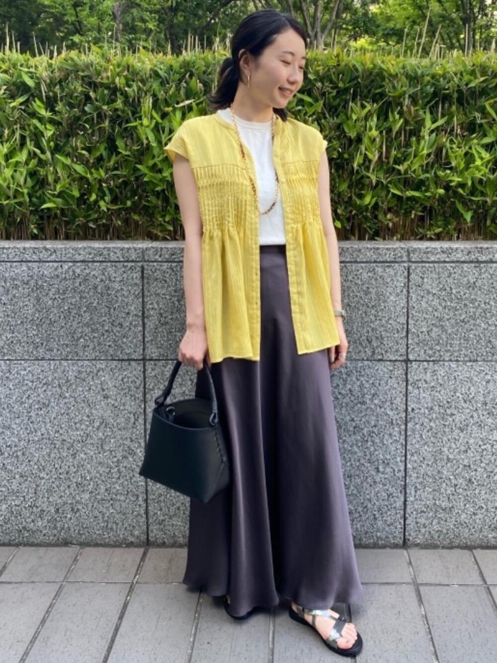 サーキュラースカートにあえて異素材のブラウスを羽織とする事で普段使いしやすいコーディネートにしております。 バックやサンダルはシンプルにまとめることで、 素材感がより映えます。