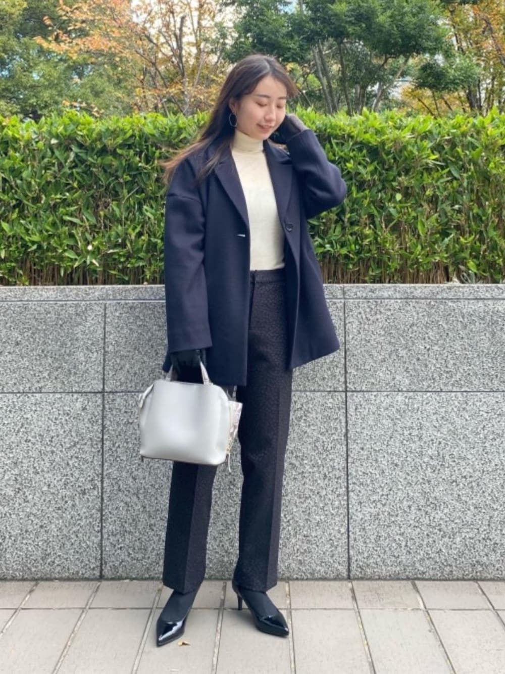・身長 158cm ・普段サイズ トップス/36(S)ボトムス/36(S)シューズ/23.5cm [サイズ感] トップス:標準サイズ アウター:ゆったりサイズ ボトムス:ゆったりサイズ シューズ:標準サイズ [コーディネートのポイント] タートルネックにパンツを合わせたシンプルなコーディネートにワンポイントとしてヒールのあるパンプスを合わせる事で女性らしさもプラスしたスタイルにしております。