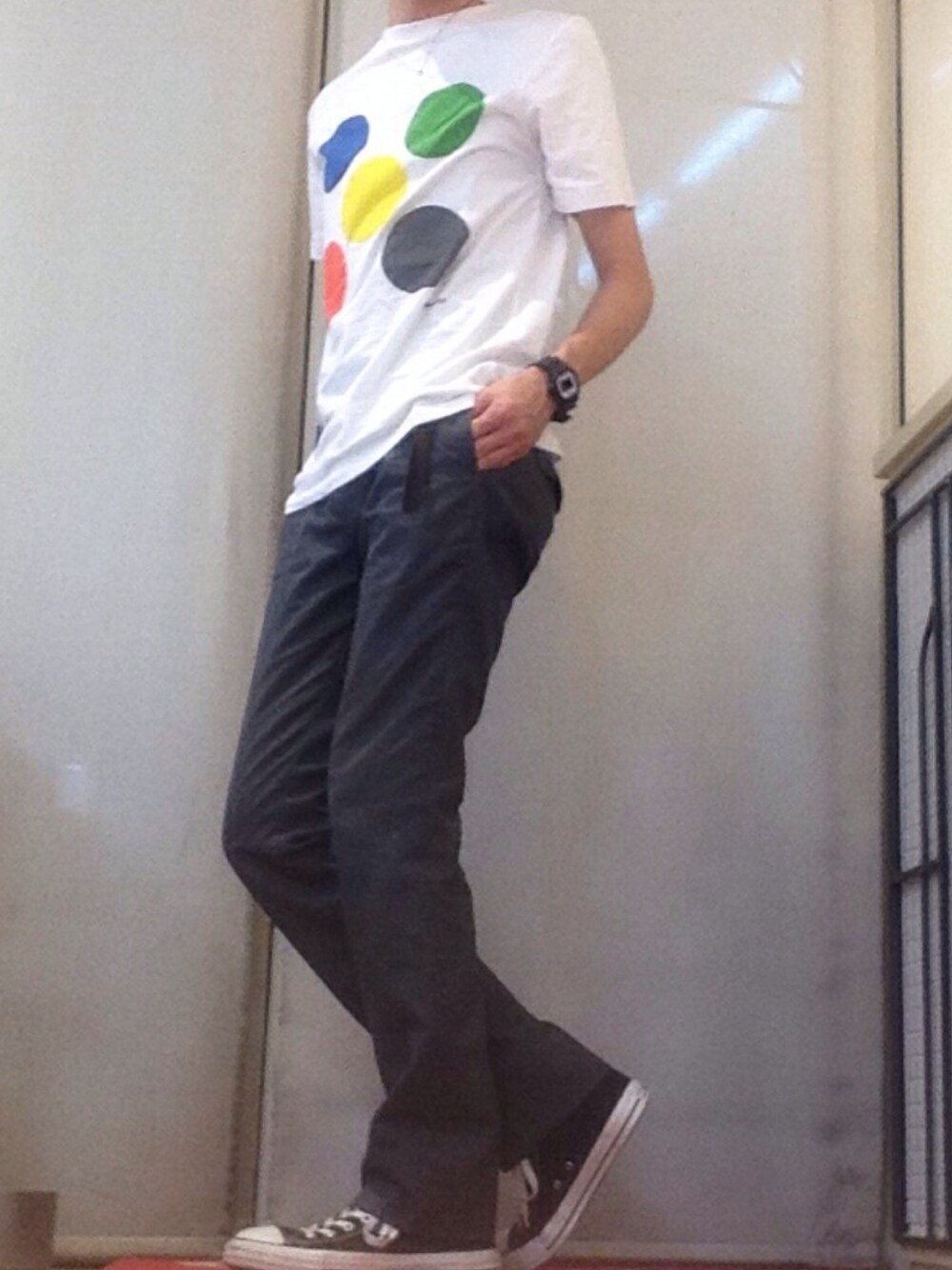 このカラフルドット! グレーに今日は合わせてみました! スラックスを入れることでカジュアルの中に少しだけフォーマルをたしてあげるのが今日の気分☻ 靴はコンバースハイカット✨ 使いやすい🙆 コンバースハイカット買おうかなあまたwグレー欲しいな◡̈⋆✨