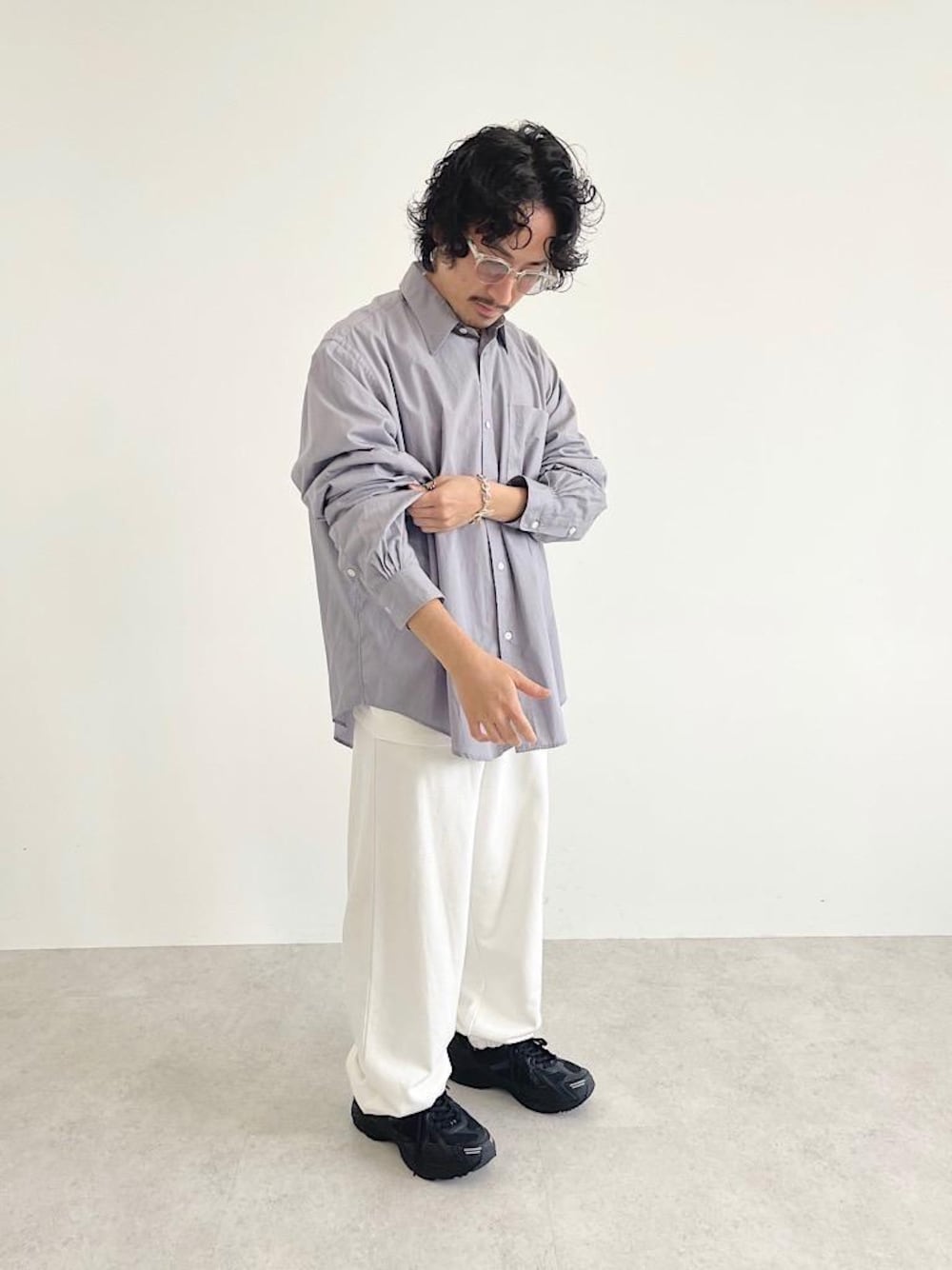 [身長] 164cm [素材感] トップス:細番手のコットンブロード ボトムス:GIZAコットンの軽くてしなやかな風合いと、上品な光沢感 [サイズ感] トップス:ゆったり ボトムス:ゆったり [コーディネートポイント] 上品な光沢感ある素材を生かしたコーディネート。カジュアルになり過ぎないよう意識。