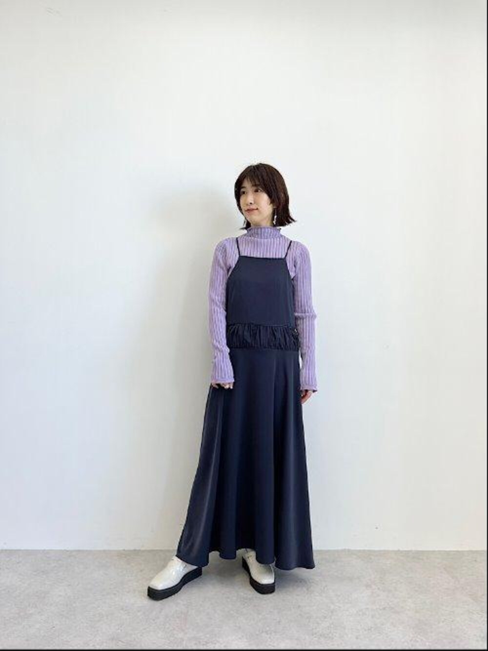 [身長] 158cm [素材感] ニット: さらりとした肌ざわりの、リサイクルポリエステル素材。 ワンピース: マットな質感とやや光沢感のあるサテン素材。 [サイズ感] ニット:スリム ワンピース:標準 [コーディネートポイント] 光沢感のあるキャミワンピースには今年らしいニュアンスカラーを合わせて大人っぽく仕上げました。足元にボリュームのあるシューズを合わせるとより今年らしいバランスになります。