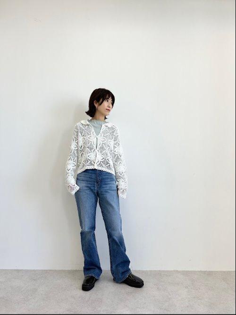 [身長] 158cm [素材感] カーディガン: 柔らかく肌触りの良いコットン素材。 インナー:非常に柔らかく肌あたりのよいコットンリブ素材 ボトムス: オーガニックコットンを使用した日本製の11.5オンスのデニム素材。 [サイズ感] カーディガン:標準 インナー:スリム ボトムス:標準 [コーディネートポイント] クロシェ編みならではの柄の透け感を、やさしいトーンのインナーで引き立てました。デニム合わせのカジュアルな着こなしがオススメです。