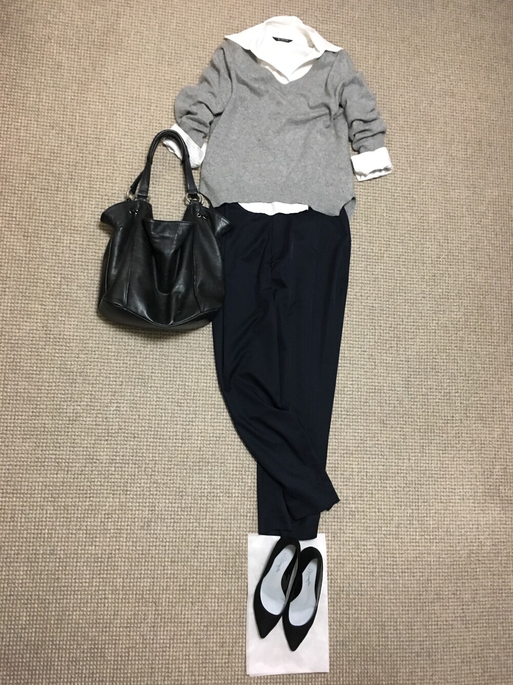 本日、最高気温17℃。春です。 トレンチコートも朝だけ着ました。 シャツ×セーター、グレー×ネイビーの 好きな組み合わせです。