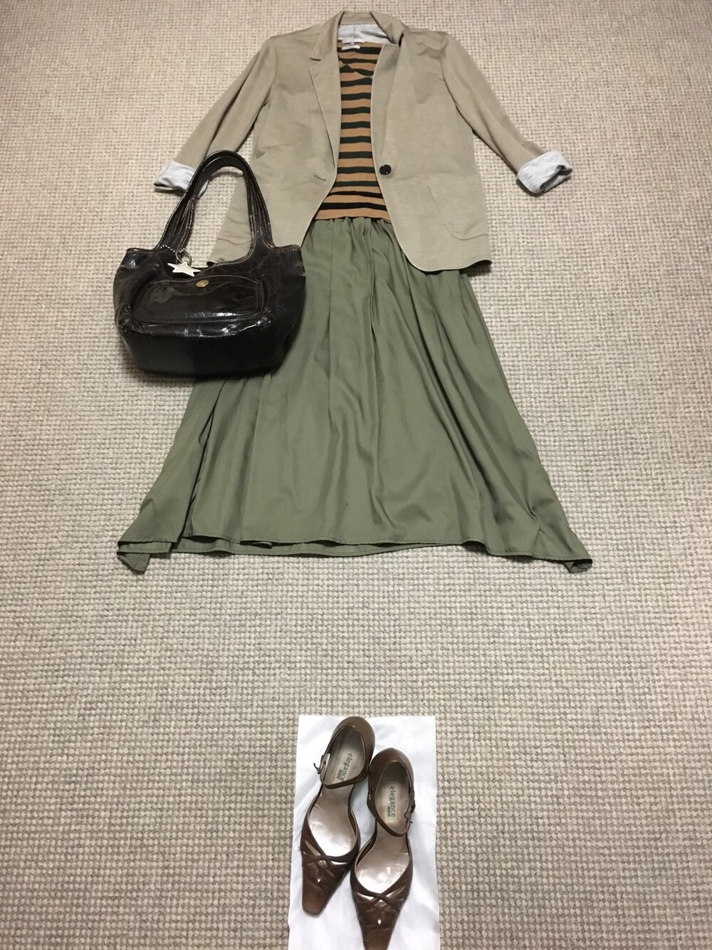 木曜日のコーデです。 思ったより気温が上がりませんでした。 なので、ウールのカットソーでカーキのスカートと合わせてみました。
