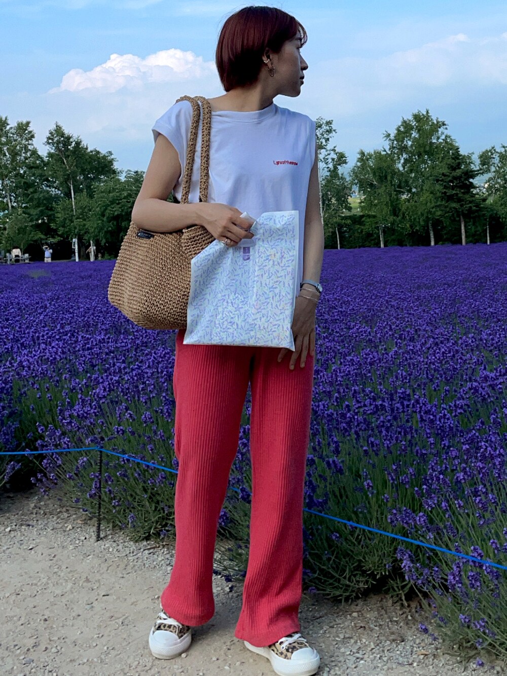 髪色をハイトーンの赤オレンジに!🍒🍊 北海道旅行で友達にいただいたTシャツとパンツで色を合わせてみました👋 パンツはニットだけど、薄くて履き心地抜群☺️ お気に入りコーデです