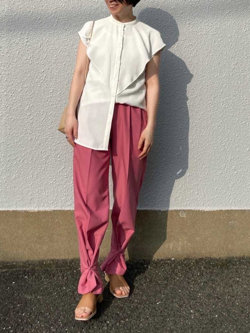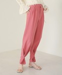 パンツのカラーをポイントにおいたコーディネート いつも二の腕が気になってノースリーブを着ることがなかったですが、このトップスは肩が落ちている+胸元のラッフルフリルで気になる二の腕もカバーしてくれる嬉しいアイテム◎ サイドにスリットが入っているのでウエストインしても綺麗に収まります ボトムは裾のボタンを留めて裾絞りタイプ、外してストレートタイプと2wayで着用可能な美シルエットパンツ! ピンクを合わせてトレンディなスタイリングにしてみました♩