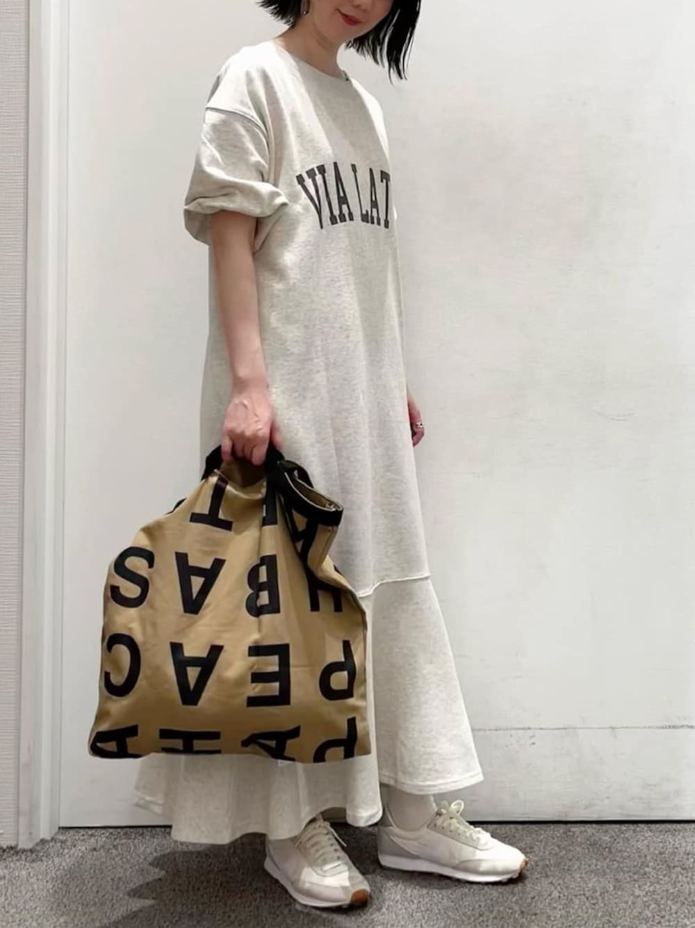 Bab pressのワンピース「【低身長向け・高身長向けサイズあり】袖ボリューム前後2WAYマーメイドスウェットワンピース」を使ったコーディネート
