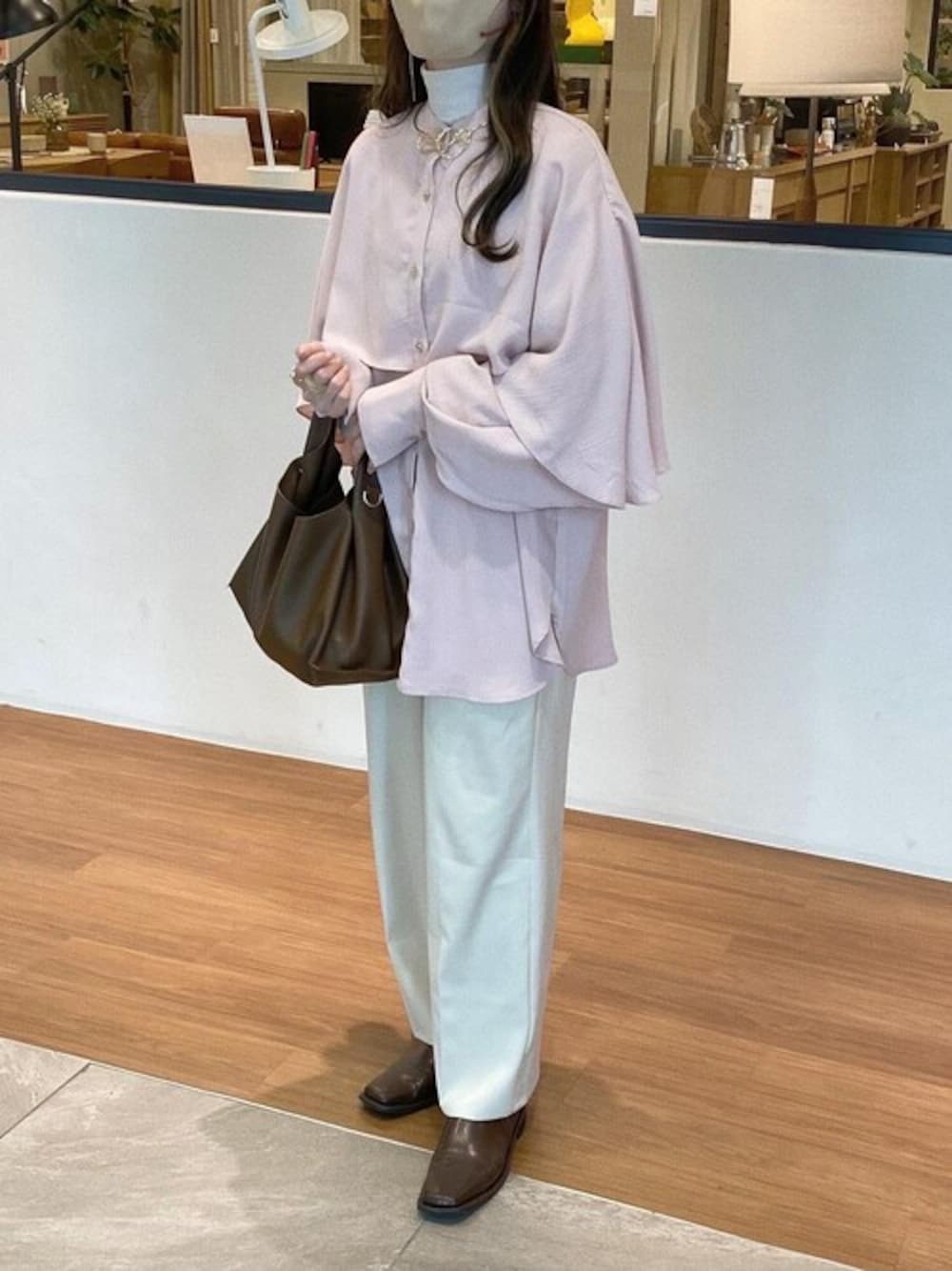 ピンク系のシャツ/ブラウスを着用したレディースの冬コーディネートの1枚目の写真