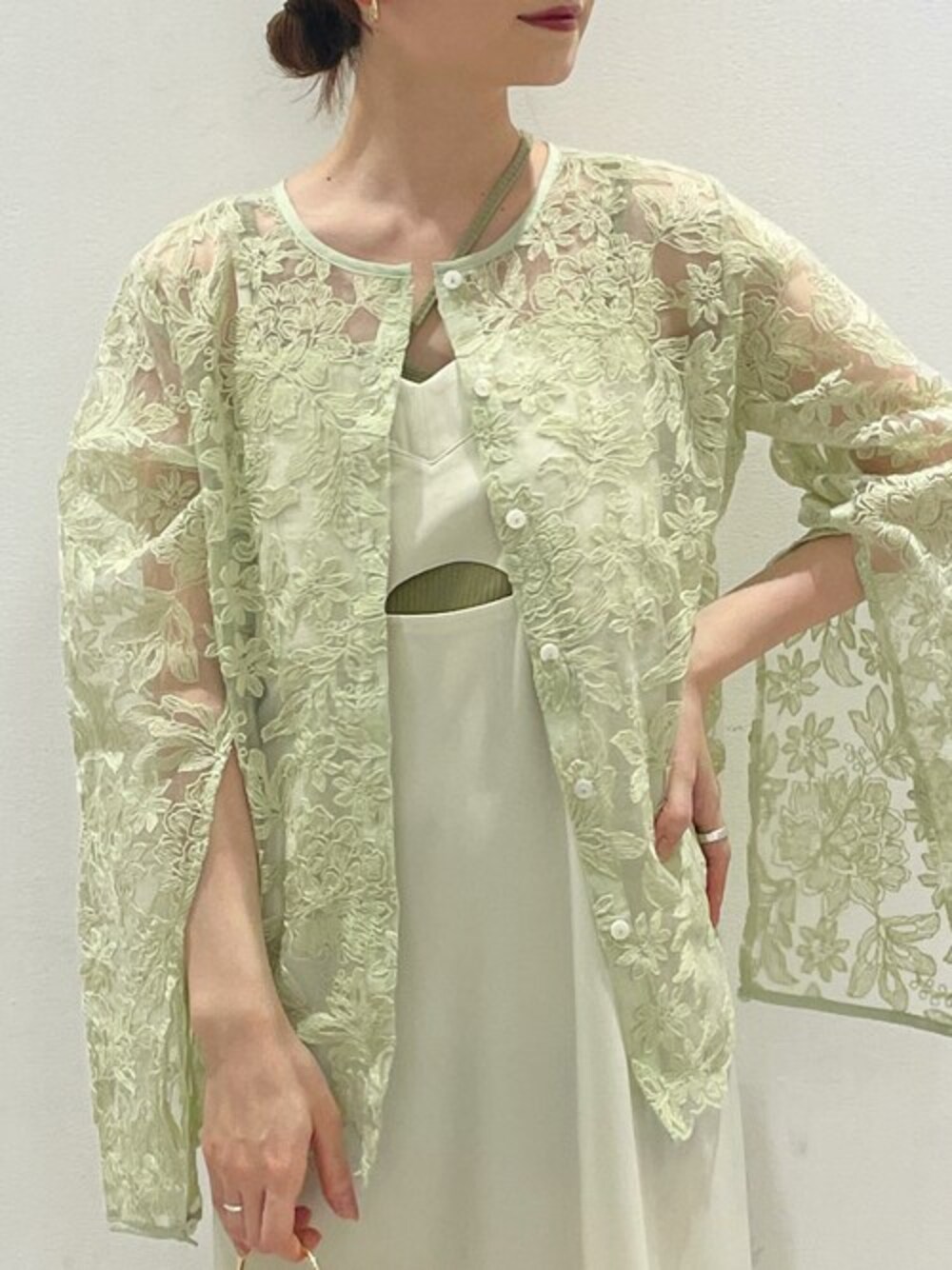 鮮やかなグリーンが映えるブラウス♡ 袖口に大きなスリットがあって、抜け感もプラスできる アイテムです! コーデの差し色にも♪