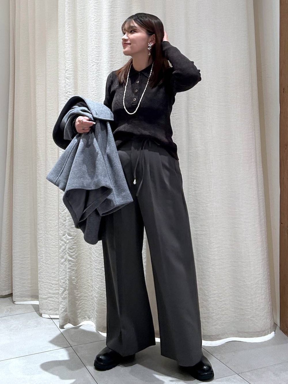 冬のきれいめグレーコーデ🫧🩶 シワになりにくく動きやすいタックパンツは シーズンレスで使えて着回し力抜群の万能アイテム。 ウエストはゴムが入っているので 履き心地も楽ちんです^^🎶 シンプルなワントーンコーデには 存在感あるパールのネックレスで キラキラ感をプラスして冬らしさを演出❄ ↓ご購入はページ下の使用アイテムから↓