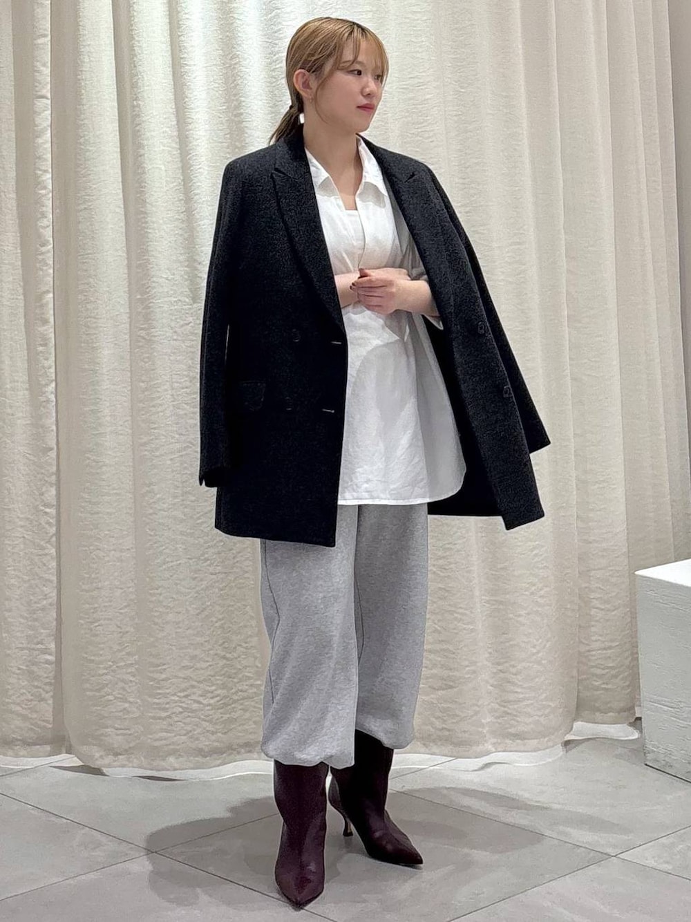 スウェットパンツを使った大人コーデ 流行りのスウェットパンツも普通に着るとただのゆる着ですが、 ジャケットやブーツなどのカチッとした印象のアイテムと合わせるとお洒落に着こなせます✨ 裏毛素材で分厚すぎないので、早めの時期から着れて インナーを着込めば冬も着れるアイテムです! スウェットパンツはかなり長めなので高身長の方にオススメです! わたしはウエストを1つ折った上でブーツインしてます