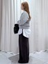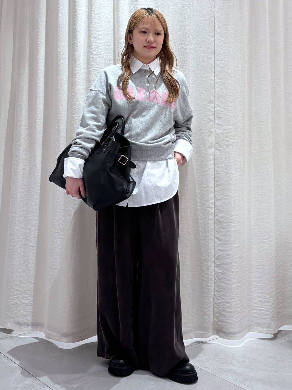 柳橋唯さんコラボアイテム着てみました🪐 カジュアルになりすぎないコンパクトサイズながらも シャツを中に着込むこともできます!◯ 袖は少し長めに持っているのことで手を長く見える& スウェットでよく起きるゆる着に見える問題も解消してくれます✨ ロゴのピンクも色味が強すぎないので 普段カラーものをあまり着ない方でも挑戦しやすいカラーです! パンツは155cmで34サイズを着用しています 落ち感があってラインが綺麗なうえにウエストゴムの楽ちんパンツ🤎 高さのある靴を履いているので折らずに着れました! ぺたんこの靴を履くときはウエストを折って履くとぴったりでした!