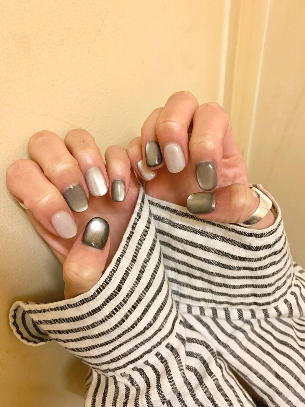 ちゅるんとしたマグネットネイル♡ 全色違う色を入れてもらい、絶妙なニュアンスにしてもらいました♪ 落ち着いたトーンで大人っぽく♡ 最近はマグネットネイルにハマってます!!
