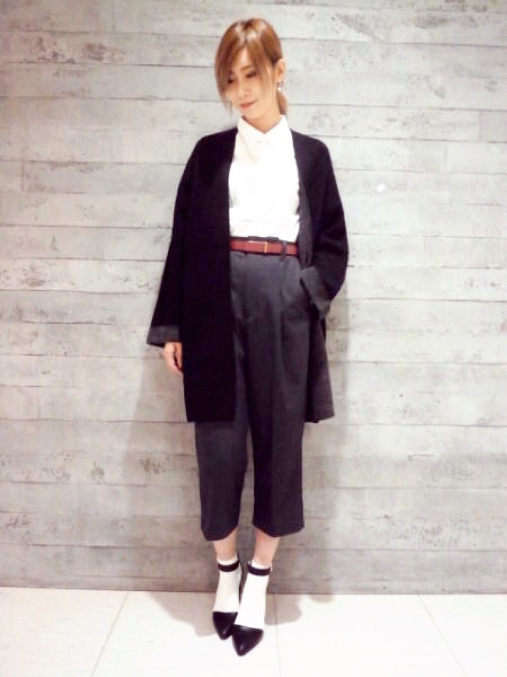 キチンとした綺麗めスタイルにゆるシルエットの羽織りを合わせると抜け感が出るので◎ ベルトの差し色でボルドーを入れると季節感が出るのでオススメです!!