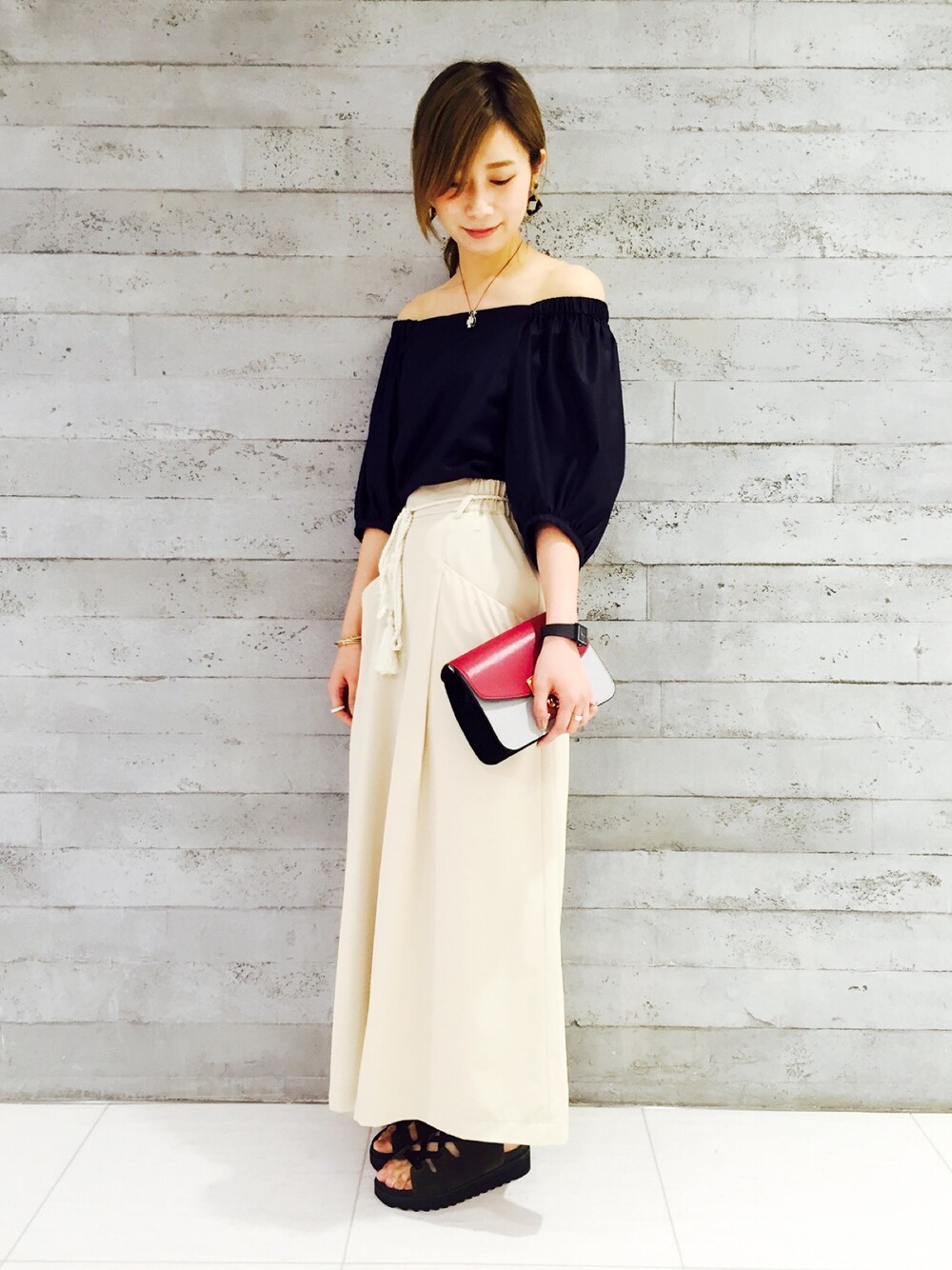 オフショルダー🙋🏻💖 光沢のある生地で大人っぽく!!! 肌見せの割合を考えてボトムスはフルレングスにしました!! カジュアルアイテムも生地感を変えれば上品に仕上がります!✨✨ デートとの時に是非挑戦して欲しいスタイリングです🙈💓 とにかくボリューム感のあるシルエットが可愛いオフショルダー!!!! 要チェックです!😤💕