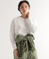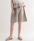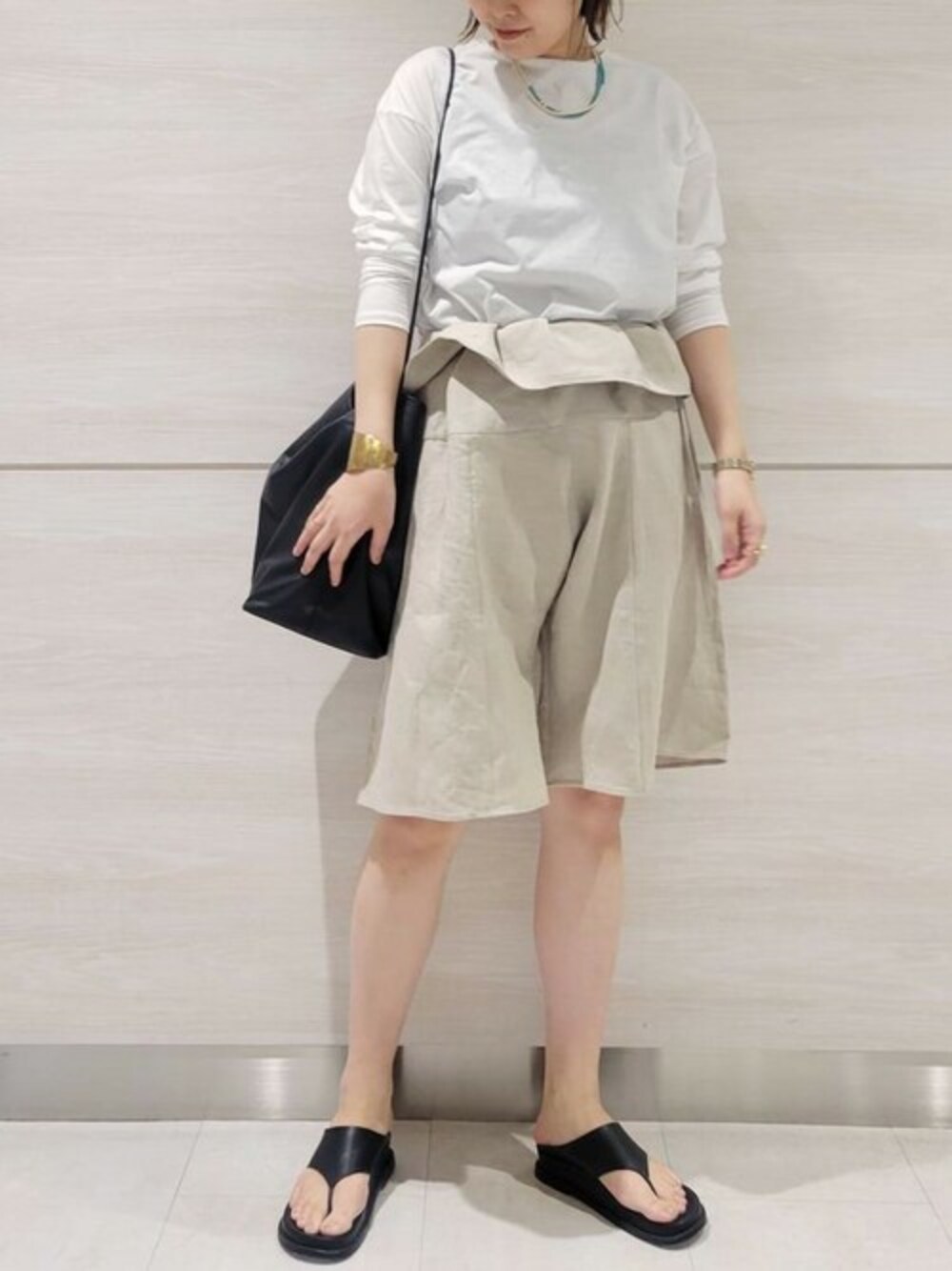 リラックスカジュアルコーデ デザイン性のあるショートパンツを主役にシンプルにまとめました。 リネン素材あわせでナチュラルな雰囲気に。