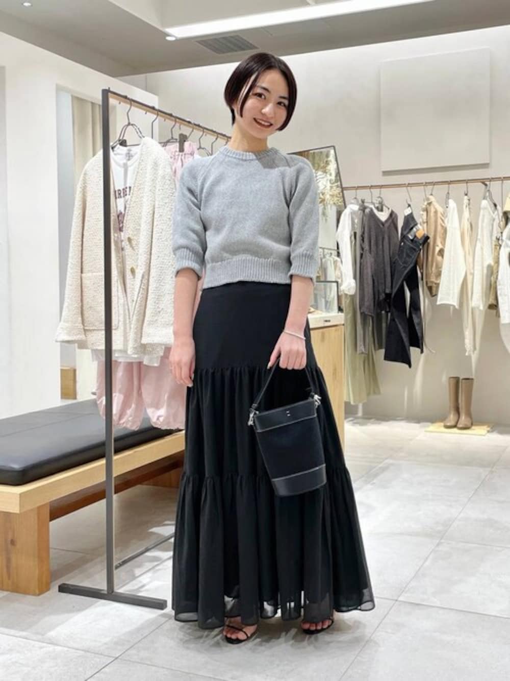 ◎トップス 短丈の綿ニットです お袖も短めで、今から長く着用できます シンプルですが肩のデザインなどコーディネートのポイントになります ◎ボトムス ティアードのスカートはカジュアルにも綺麗めにも履ける万能アイテムです 今からオールシーズン着回せるスカートです