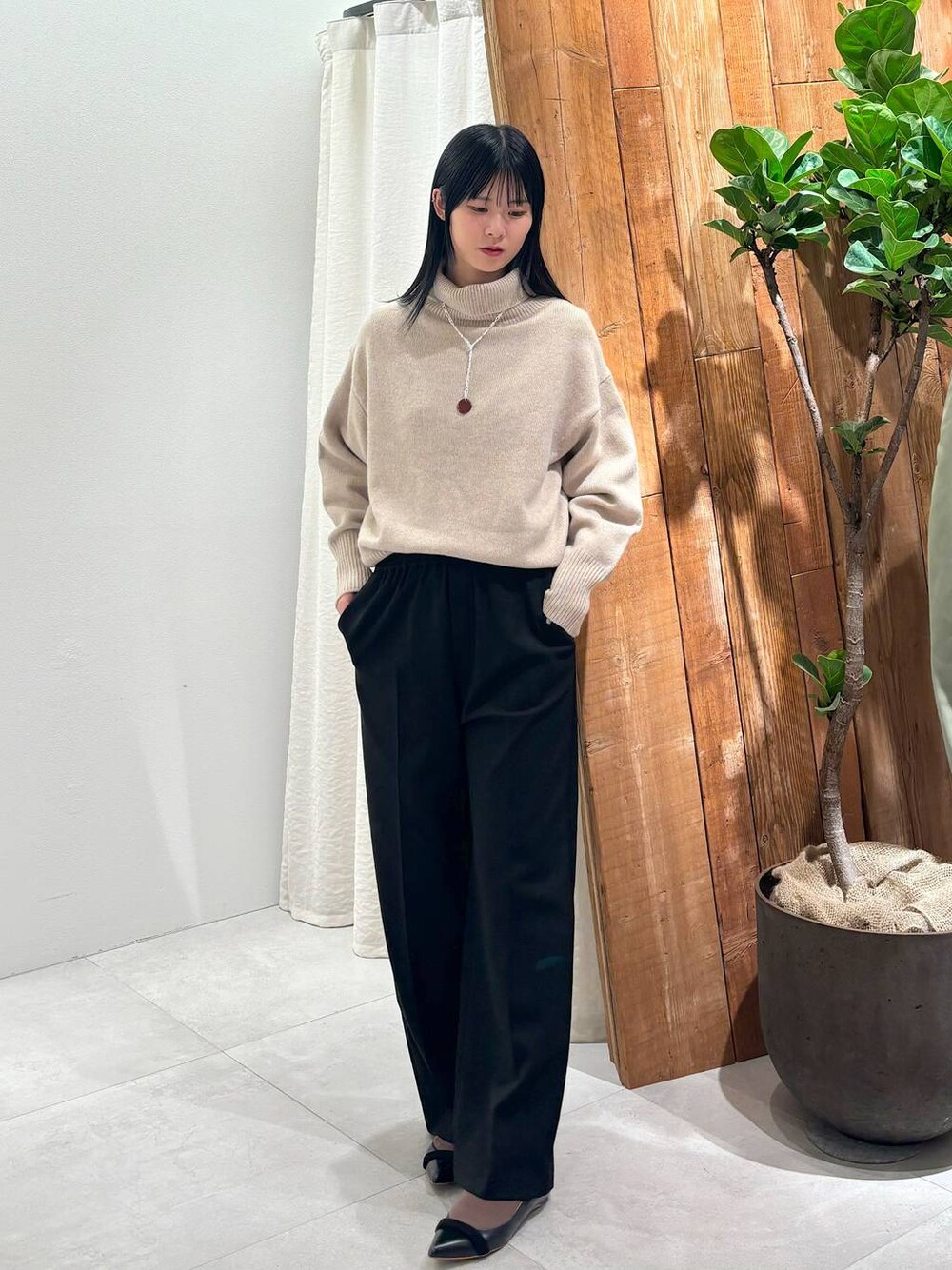◎ウールカシミアタートルネックプルオーバー カシミア混合で直接肌に触れてもチクチクせず、 ウールなのでしっかり暖かいニットです! タートルネックもピタッとせずゆったりしてるので タートルネック好きな方はもちろん 苦手な方も着やすいタートルネックです! ◎裏起毛イージーパンツ フェイクファスナーがしっかりと見せながらも ウエストがゴム紐という実は楽ちんです!が 叶うパンツです 裏起毛がふわっとしていて寒い日でも暖かく履けます しっかり見せも叶うパンツでシンプルなので オンオフ両方にもってこいなパンツです