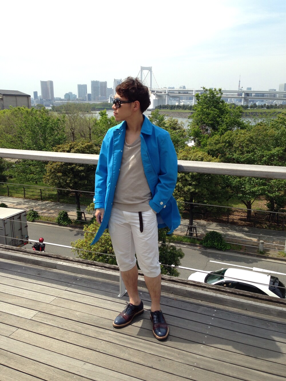 レインボーブリッジをうしろに。 5月の装い。 コート:Green label relaxing ニット:GAP パンツ:UNIQLO (+J) shoes:BUCCUS eyewear:marc by marc jacobs 流行りのブルーを活かしたコートが季節にぴったり。