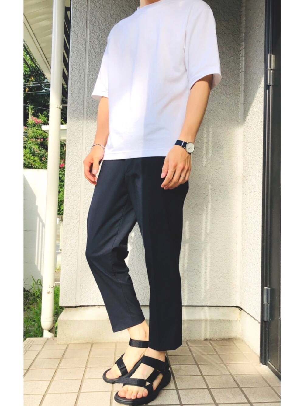 はじめまして! 休日コーデを保存用で投稿していきます! ユニクロUのエアリズムTシャツが良過ぎる… ネイビーのアンクルパンツと合わせて(少し)キレイ目に