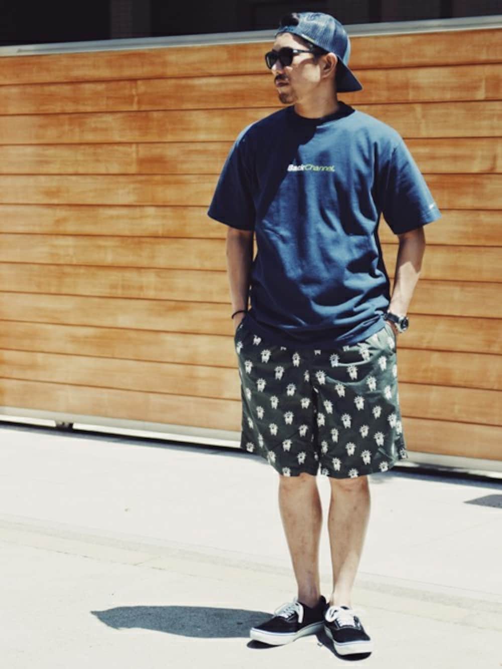 薄く肌触りの良い総柄ショーツに、バックにMAPのモチーフがプリントされたTシャツを組み合わせ、 通気性の良いメッシュキャップでアクセントを付けたコーディネート。