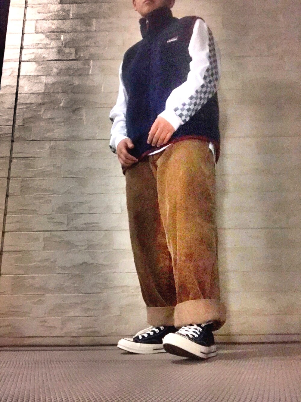 市松柄を日本伝統の刺し子織で作られたKUONのロンTを強調させました。 niko and...のパンツも太くておススメ。