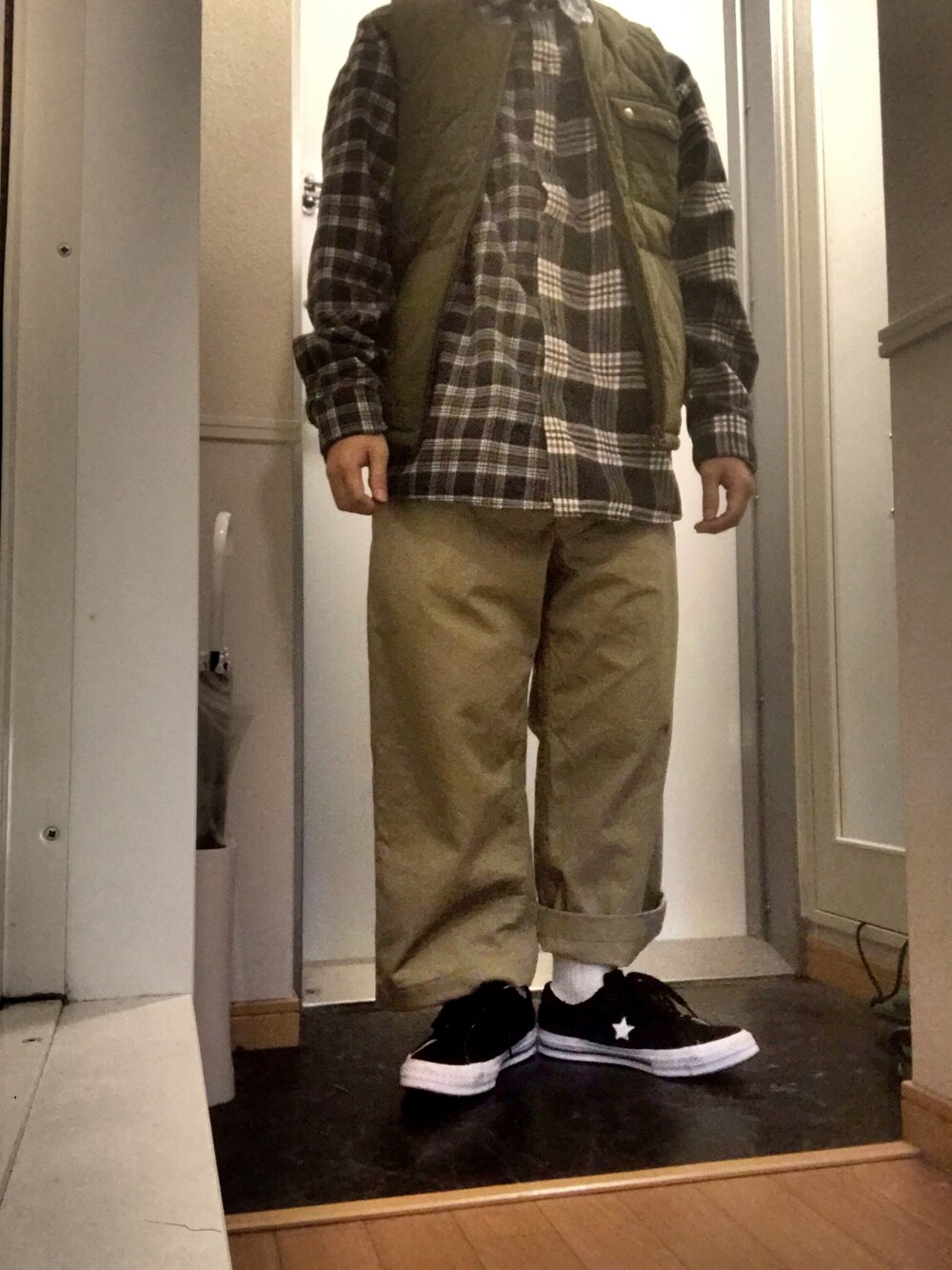 ミリタリーコーデ。 ハーフアンドハーフで柄が変わっているシャツはとても可愛い🤤 converseはブラックスエードのone starの紐を黒にして落ち着いた印象に。 フランス軍のチノは、“ださカッコいい”。