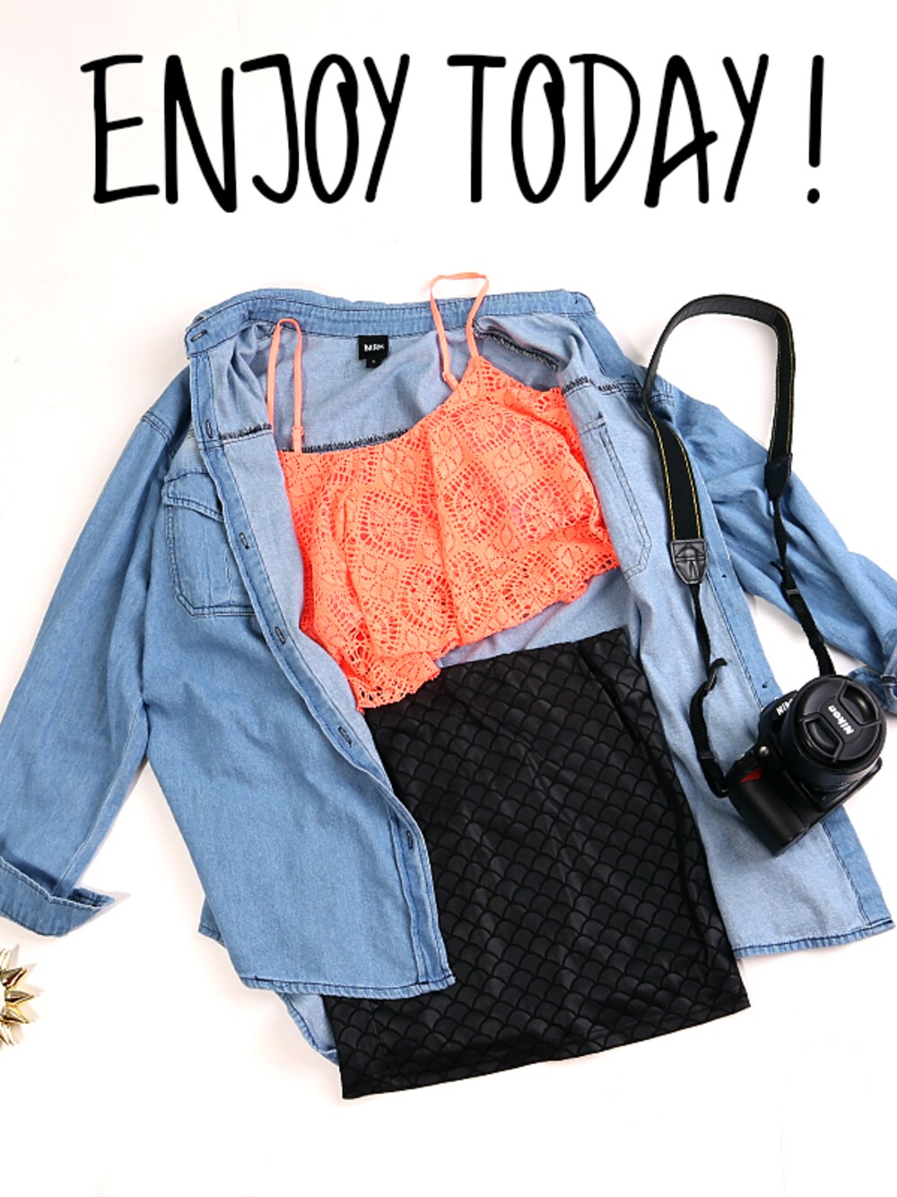 • 1) デニムシャツ: OVERSIZED DENIM SHIRT - BLUE https://www.bkrm.com/en/shop/ladies/urban/tops/oversized-denim-shirt-blue 2) タンクトップ: LOVERS + FRIENDS - DELIGHT CROP TOP - CORAL LACE https://www.bkrm.com/en/shop/ladies/urban/tops/lovers-friends/delight-crop-top-coral-lace 3) スカート: All Day - VERANDA MINI SKIRT - BLACK SCALES https://www.bkrm.com/en/shop/ladies/urban/bottoms/all-day/veranda-mini-skirt-black-scales WWW.BKRM.COM