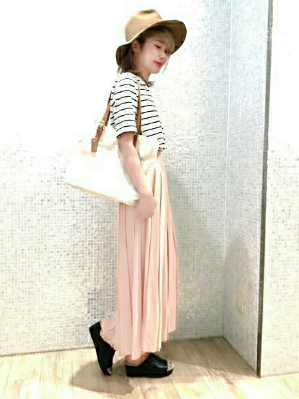 ベージュとピンクの淡いトーンを合わせたコーデです(´・ω・`)/~ ふんわりだけど小物でどこか大人っぽく仕上げました♪ スカートもと