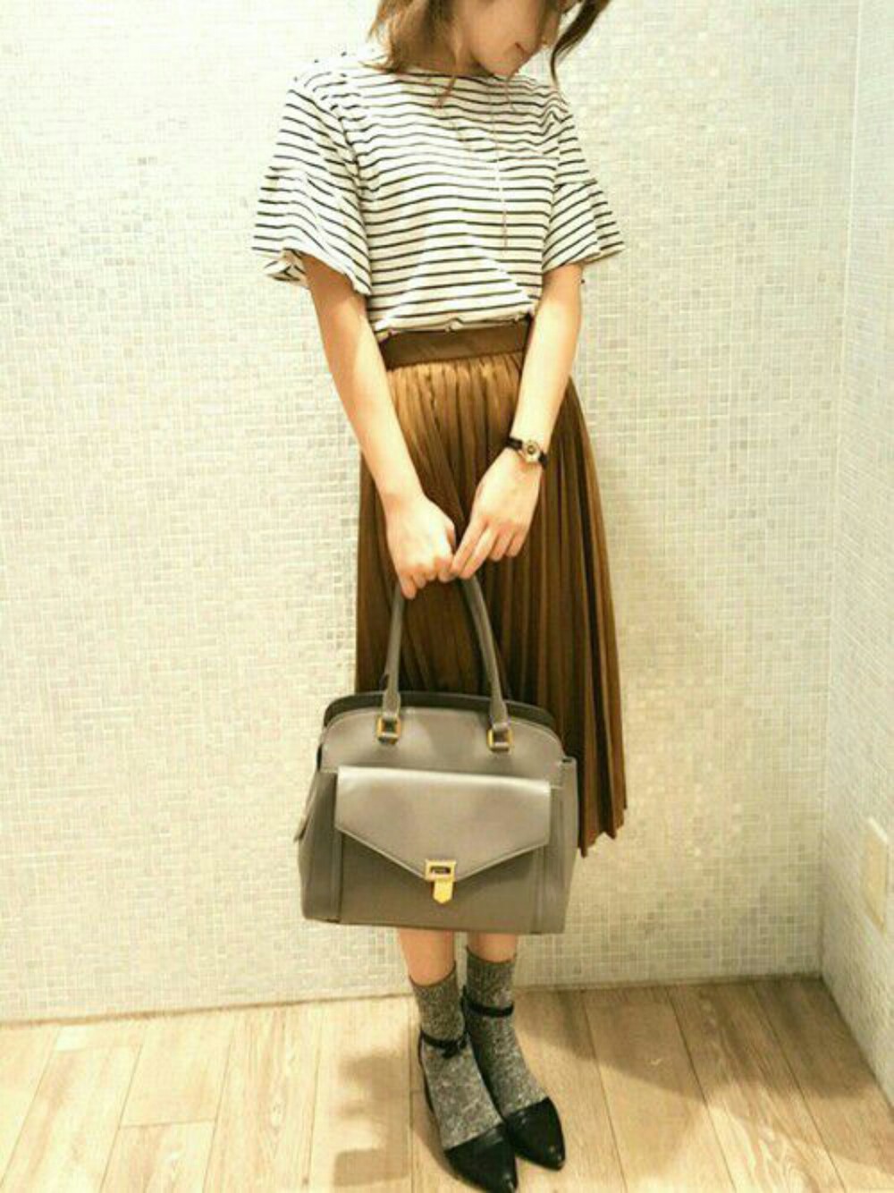 通勤コーデ💻💼📝 秋カラーをふんだんに使ったコーデです(^^) 夏物トップスもシューズにソックス合わせだったりカラー合わせで雰囲気が変わるのでまだまだ使えますよ♪ 去年かったローリーのスエードプリーツがお気に入りです😆
