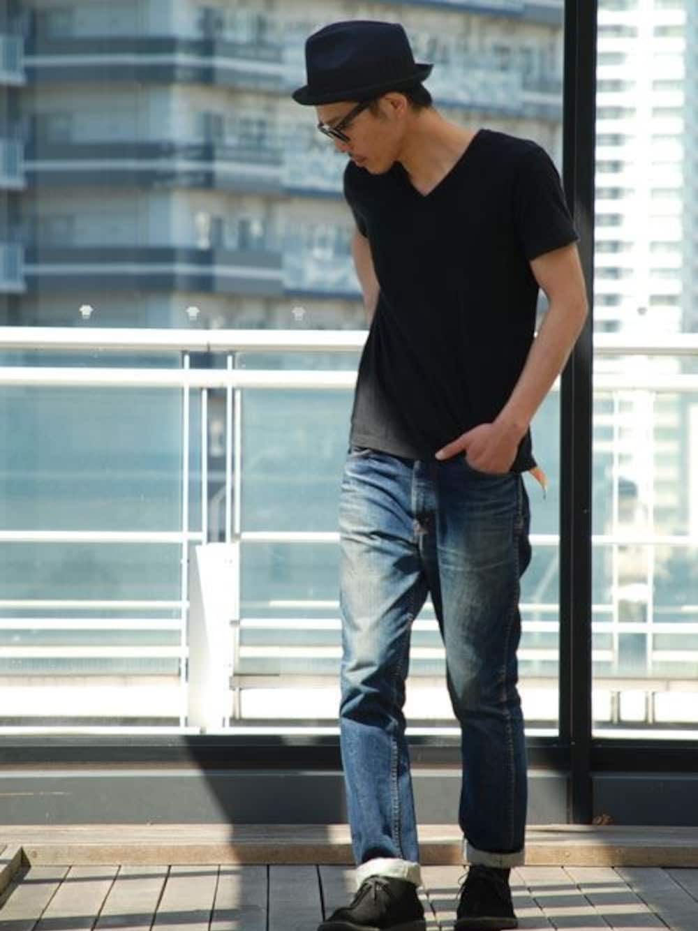 デニム×Vネックカットソー×2トーンストローハット デニムに無地のVネックカットソーのシンプル定番スタイル。クールな印象の2トーンストローハットを合わせる事で全体的に大人っぽい印象に。