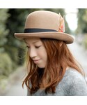 羽がアクセントになるフェルトボーラーハット 頭の部分が丸くブリム(ツバ)が普通のものよりも短いのが 特徴的なハットです。