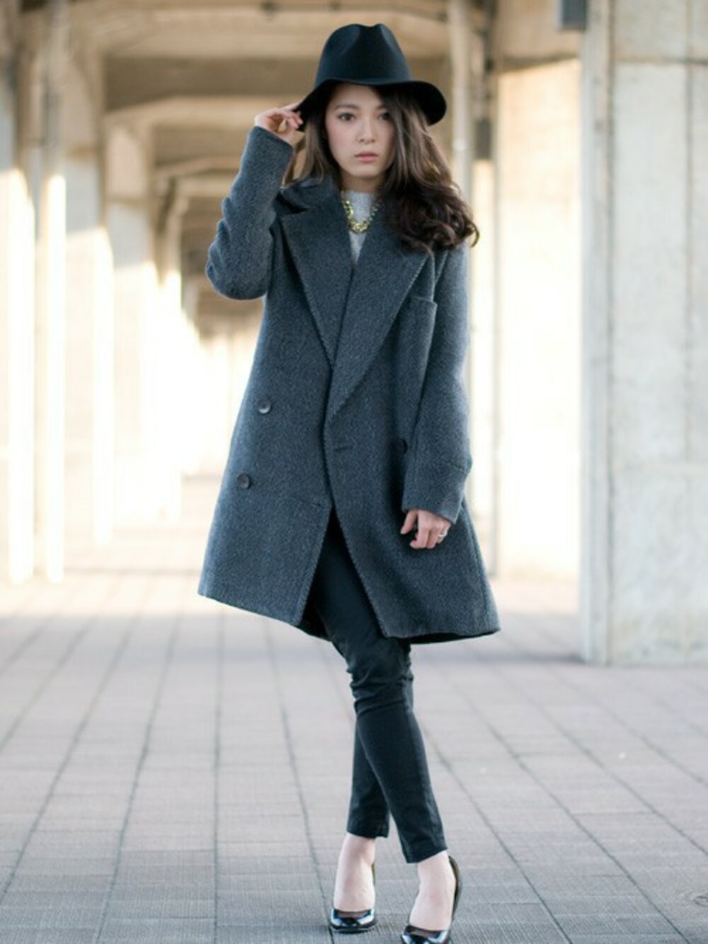 トレンドのつば広ハットコーデ チェスターコートをあわせて今年らしい雰囲気に。 コートは丈がながくてゆるめなのでタイトなボトムスを合わせてバランスを整えました。 足下は黒のパンプスで女性らしさをキープ。