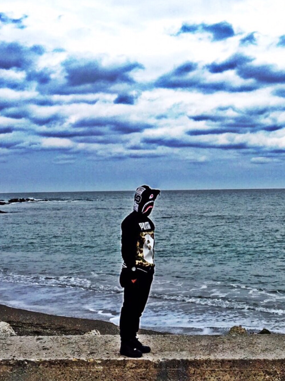 シャーク持ってたら1度はやってみたいやつ! 海行ったら寒すぎて完全防備。 AF-1のブラックはシンプルにカッコイイです💯