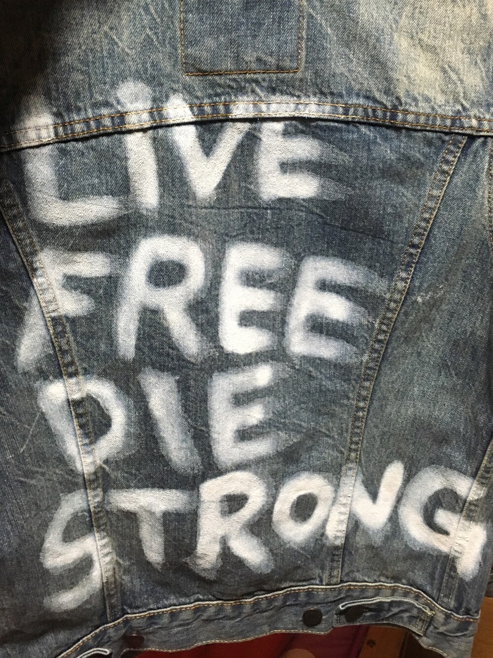 安いデニムジャケットにgarçonルイスの背中の文字をかきました! なかなか上手く出来たほうだと思ってます💯(自己満) プルオーバーのパーカーをダメージ加工したいのですがいい方法知っている方居たら教えてください😔🙏